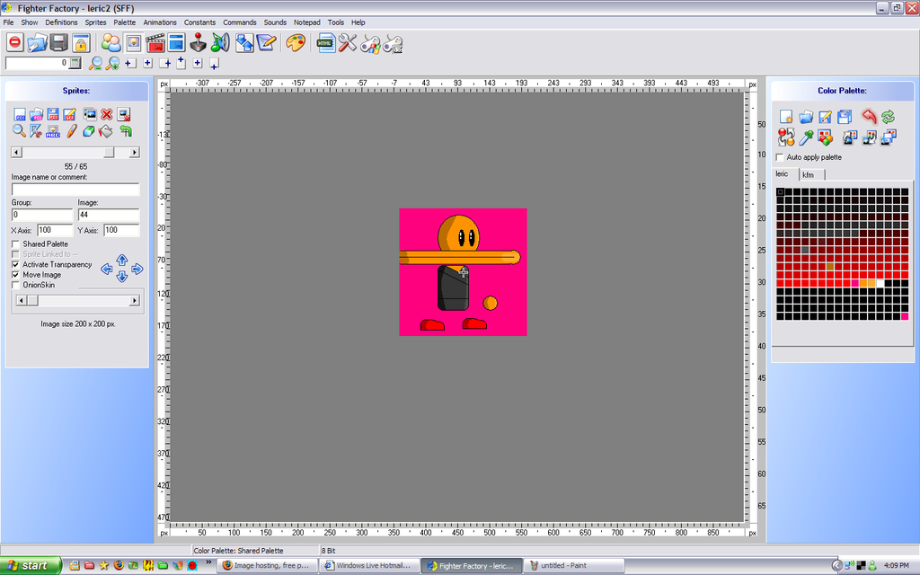 I meant posting the sprites themselves - as the original pcx files. But right like that, I can see that you have two "pink" color slots in your palette. The ones that appear with the box around probably have their pink color associated with the wrong one.Try replacing the pink in the middle by, say, black or green or whatever. Do that in the palette itself, then make sure the palette is applied to all the sprites. Then, see all the sprites that were affected : they are associated with the wrong slot. These pixels have to be associated with the pink in the lower right corner.I don't use Fighter Factory, usually it seems like it's dealing with the palettes in an odd way. For example, do you actually use that many shades of red and black ?Also, it might help too to post the very first sprite in the sff - instead of sprites 51, 55 etc. If all the sprites have a "shared" palette, they're all referring to the palette of that first sprite.