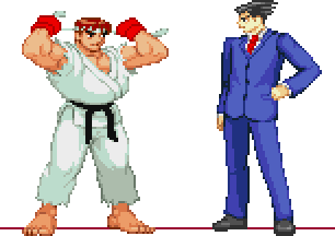Thanks for the comments everybody.So let's start answering all of them:【 HadeS 】 said, December 11, 2014, 12:15:53 amI like it but... I still think it's short.What about using Steamboy's base? Or Shin Otaru's version? Steamboy's sprite was the first that came to my mind (never heard about Shin Otaru's). The thing is that I want him to have the right height and width in game, some of Steamboy sprites aren't of the right size, also it uses too many colours GoodAldo is going to kill me. I want to make the sprite in true CPS2 style (or very close).From the wikis I read that Ryu is 175 cm tall and Phoenix is 176 cm tall. My sprite (sprite edit) is being too tall even:I'm not trying to defend myself from the feedback, if it's needed I can fix him right away, that's not a problem. If you can show me I'm wrong, I'm here to fix it. This goes for everybody.Black Hatter said, December 11, 2014, 01:09:01 amHmmm, I'd say Alex should go with Steamboy's version. Since he's doing it in CPS2 form, it would make a better base for proportions and shading rather than ShinOtaru's CvS sprite (which looks mundanely perfect, IMO). I say make him wider by a pixel or 2, so it could be similar to Steamboy's rendition.Anyways, Phoenix Wright is one of my fav. Capcom characters of all time. Hearing the possibility of you taking up a project like this actually puts a smile on my face. Good luck! I concur, Shin Otaru's sprite is really good, but I'm not going to make him in CvS style. Steamboy will be a reference for a lot of stuff I might have trouble with, but I'm not sure about the proportions. Because of what I said before.Do you want to read a funny thing?I never played the games, so this can be a reason to start. Facepalm worthy, right?MotorRoach said, December 11, 2014, 02:57:33 amCPS2 or CvS, I'll cry lawyer tears of joy if you really start on a Phoenix Wright project.On the sprite though, I feel his hair could be a little spikier, and he skin looks a tad too yellow. And yeah, Steamboy's sprite is a wonderful reference.I can move those two pixels up a bit and change the palette.Thanks again.