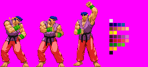 There's actually another sclera shade that appears on several sprites, and another teeth shade as well. I'm also gonna repost this:Jmorphman said, April 27, 2014, 08:45:26 amBecause Ryu and Ken are headswaps, and because they share so many moves, it would save a ton of time if you used my Ken separation as a base for Ryu. This includes gloves, belt, and pants; though hair definitely would need to be redone for all shared sprites, and probably teeth and the eyes, though. I am however currently in the middle of revamping my Ken separation so don't go using the one that's on my site. If you want to start right away, I already have done everything that would be shared with Ryu save for their gethits, and the latter should be done sometime next week, hopefully.Using my separation will help! And make it go faster! And as of today I've only got ~50 sprites left to fix!