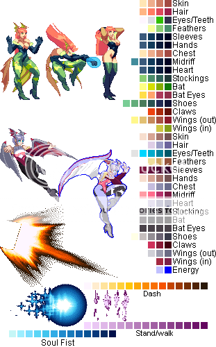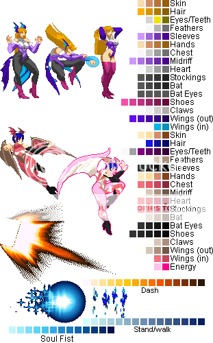 Morrigan template has some errors Lilith's Bat eyes share with her wing claws, her head wings share a color with Morrigan's boots and her hair with the Stand/walk aura. Christakos, NikitinGirard, Zero, KajiLight Purple & Black, Blue Tones, Griefstrike