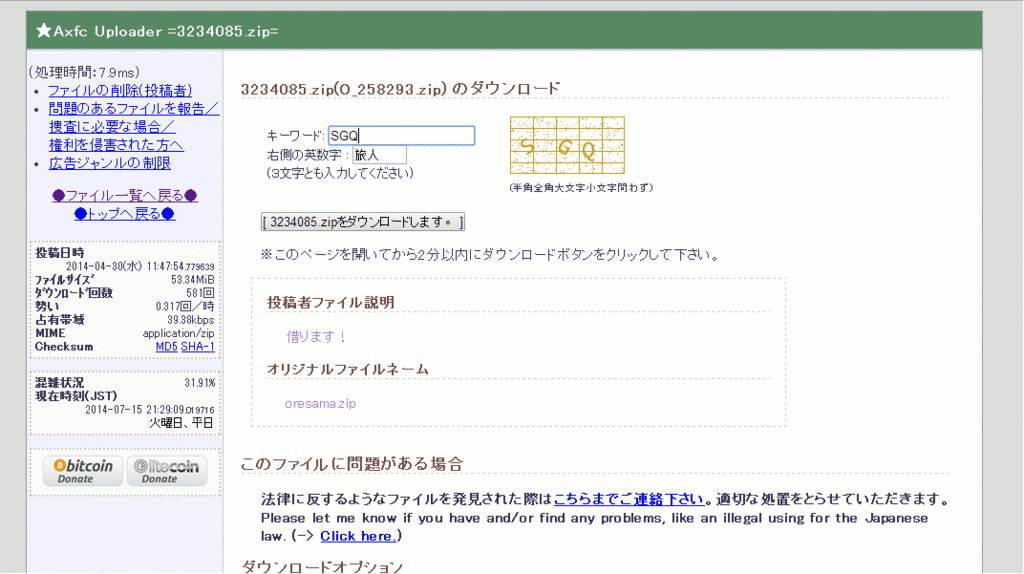 This site hates me.Spoiler: don't mind this (click to see content)It redirects to a page that tells me:Quote画像認証に失敗しました認証で入力もしくは選択された英数字が正しくありません。(旅人)入力画面に戻るブラウザのバックボタンで戻った場合は一度再読込を行って下さい。QuoteI failed to image authentication Incorrect alphanumeric characters that are selected or entered in the authentication. (Traveler) I return to the input screen Please re-read once if the user returns back button on your browser.Tried other ways, like writing the password first and the captcha second. But I can't get the file. Never mind. I did it.Excahm, you have to write the password in the first bar and the captcha in the second one, so you can get the file.