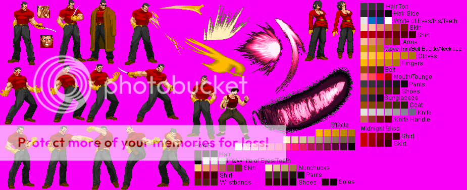 I'm a bit annoyed right now. I wanted to make one final update to the .sff to make the X on the belt an entirely independent color, but Fighter Factory will give me some sort of "wrong sprite order" error any time I try to replace the sprites. It's just 22 sprites so If anyone else wants to try adding them to the .sff then be my guest.