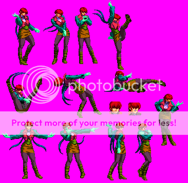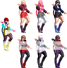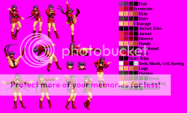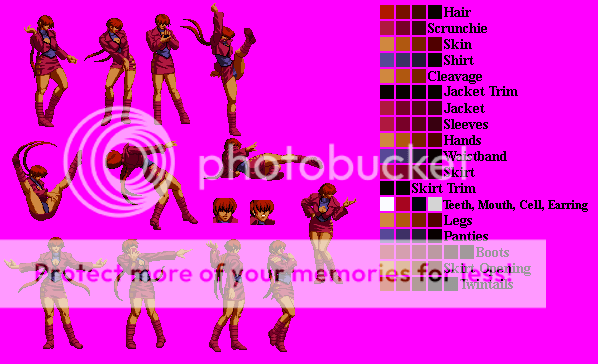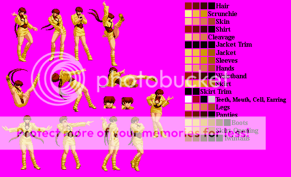 All right kept it the same but added separation for her Underwear, Cell Phone,Earrings, Mouth and Teeth. Only problem now is Ahuron's Shermie has all her effects and other miscellaneous stuff separated and they fill up her Palette table and even when i make duplicate colors share there isn't enough room. So unless i can cut the effects down enough or someone plans on making a Shermie i may just skip doing a patch and just release the Sprites when their separated. Also does anyone know if any Midnight Blisses for Shermie exist.
