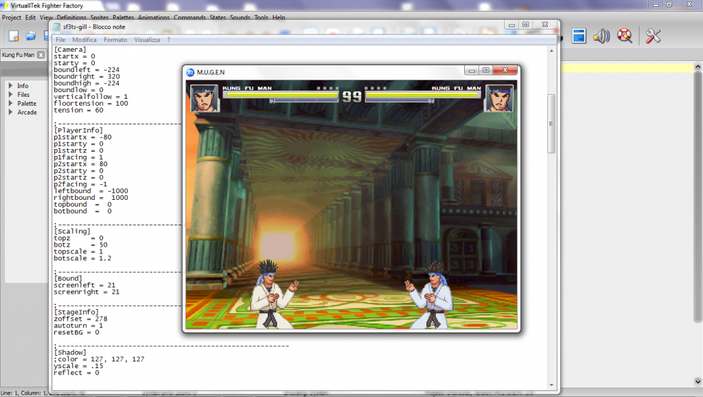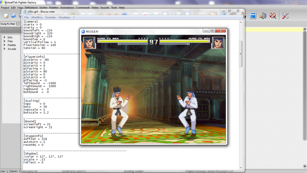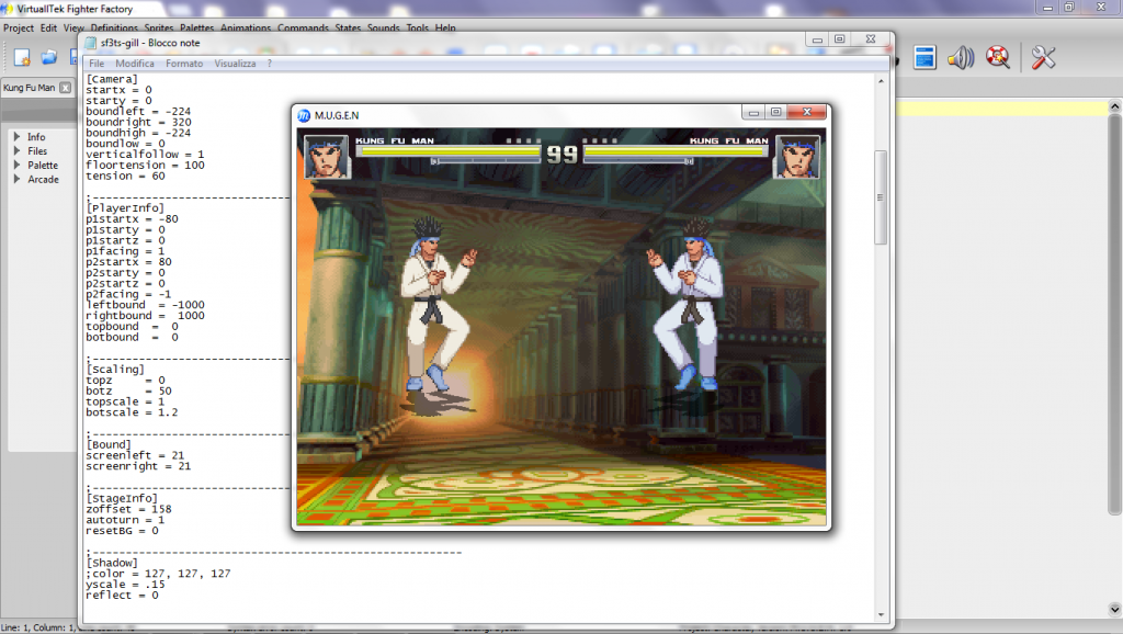 Ma anche tu, come fai ad usare Mega se sei italiano?!?Ma che diavolo, anche a me funziona adesso? Com'è possibile?Dico così per questo: http://www.yourlifeupdated.net/guide/mega-co-nz-chiuso-bloccato-e-oscurato-in-italia-ecco-come-accedere-nuovamente-dallitalia/Forse si sono svegliati finalmente.Comunque l'ho scaricato, adesso vedo che fare.Allora, credo di aver capito.Modifica nella sezione [Camera] il parametroCode: boundlow = 0Prima avevi messo 215 di zoffset, poi 185. Ho fatto la sottrazione e ho ottenuto 30, metti quello come valore del boundlow.Aspetta che non ho finito, devo risolvere un altro problema dello stage.Comunque la risoluzione del mugen è 1280 x 720, vero?Ad ogni modo, oltre ad un effetto grafico (metti mask = 0 perCode: [BG background]type = normalspriteno = 0, 0layerno = 0 start = 0,0;-224, 0mask = 1delta = 0,0trans = nonecosì vedi il fucsia/magenta della zona da finire) c'è anche il problema dei limiti dello stage; se sono settati male possono permetterti di fare delle infinite (combo infinite che possono uccidere il nemico), e tu non lo vuoi, vero?Purtroppo però. se si mettono a posto non puoi goderti tutto lo stage (vedere il palo a sinistra e la montagnetta a destra), a meno che tu non voglia stare con i personaggi sopra il palo o la montagna e sarebbe sbagliato.Per correggere i limiti devi agire sui parametri:Code: boundleft = -30;-64boundright = 30;64nella sezione [Camera]; come vedi, al posto dei valori originali, ho messo -30 (a sinistra) e 30 (a destra).Avevo provato a fare in modo che si potesse vedere tutto, ma non ci riesco.