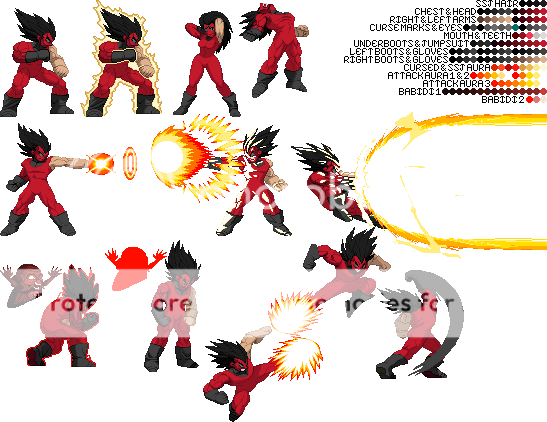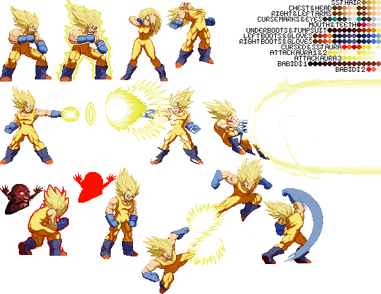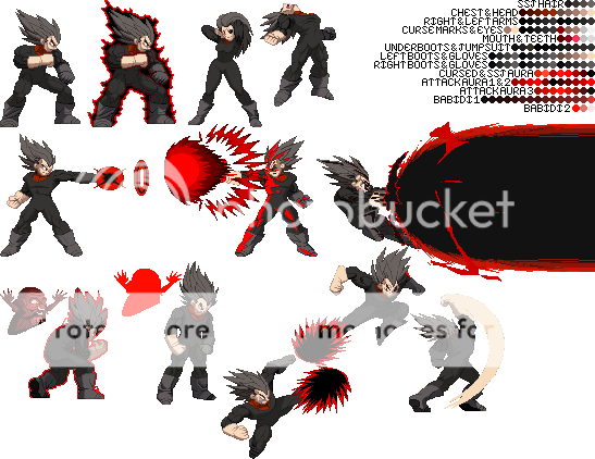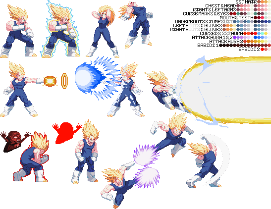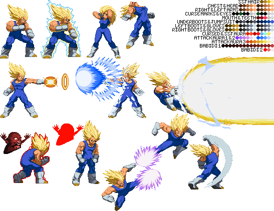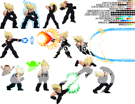 Blue Sun Studi-Update:I had to get this out into the public before too much of my time was taken up. If any of you remember the palette template I made back on the Z2 Sprite Thread, then you know that I've made a pseudo-palette template using sprites before (some of which where ultimately unused). Here are the official ones I plan on using:TEMPLATEAlternate TemplateThe first one of for an idea of having coding like SF3 Gill, while the second one is for without the SF3 Gill coding. Until Majin Vegeta is given a single line of coding he will share Vegeta's SFF, which I separated minus the idle stance and maybe one or two animations he never uses. I've sent both versions of the SFF to Cybaster and he'll be checking it out to see how it will work. In the meantime, I'll showcase some of the palettes I've made for both versions (although I'll only show the first version) to give you an idea of how they'll look when MV is spruced up:Default v1Default v2Default v3SSJ Goku Z2New TDC SSJ5New Galacta KnightKazuyaKazuya SuitPlease note that all curse marks and hyper dimension aura sprites not done by Balthazar will be done explicitly by me unless the other Team Z2 members choose to do so. And I may be quite a bit unusual as to how said sprites will work. In the meantime, just be patient and if you want you may make palettes with the new templates. I'll go through some of Balthazar's current animations for MV, extract them, and index them with the colors shown in the templates, as well as remake my palettes. With the addition of the aura there, the original authors can remake their older palettes, or I can do that and add different colors to the aura myself. With that said, I'm signing off the air.