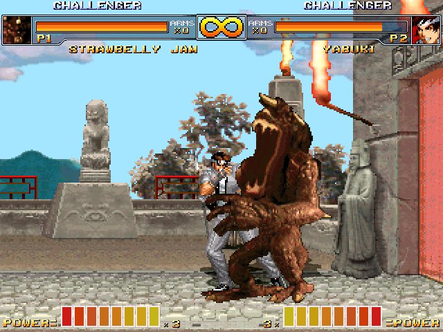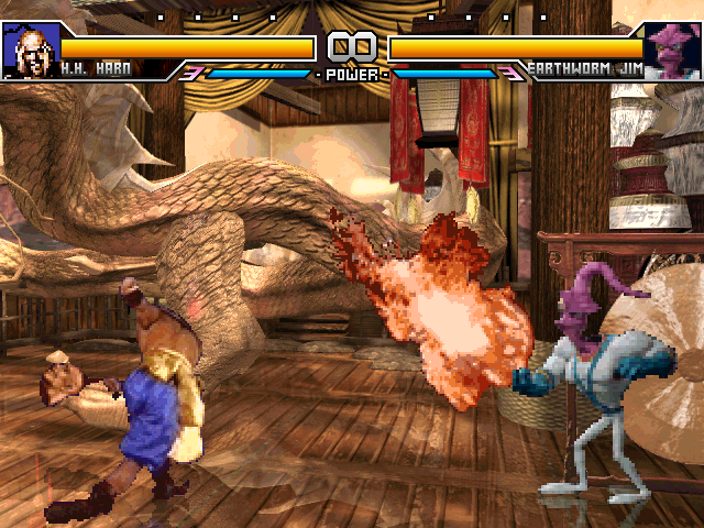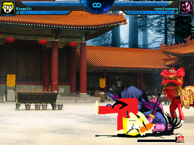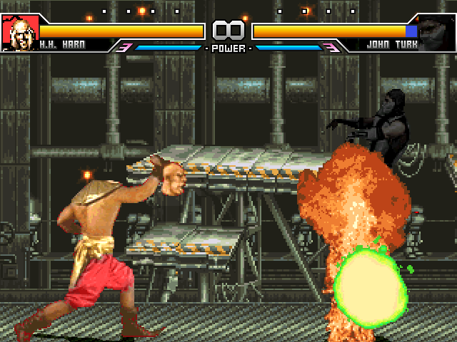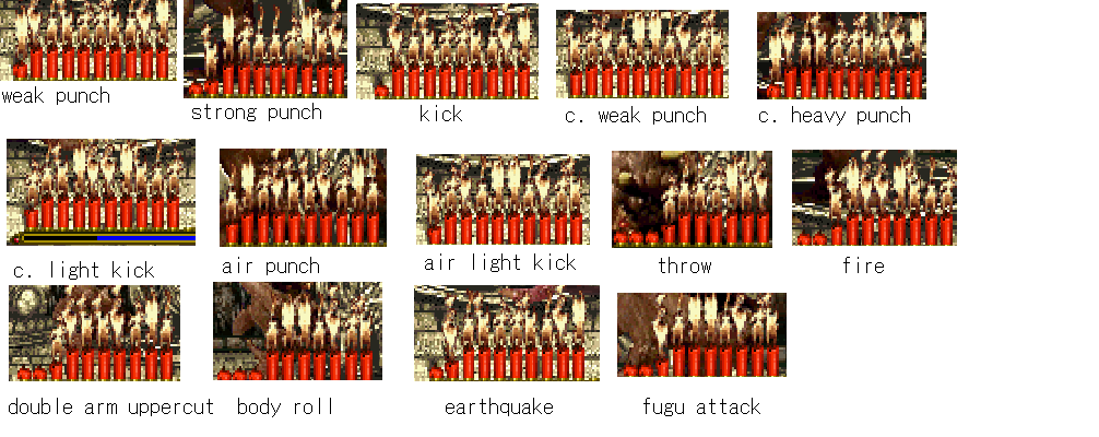 well, just showin' off a few screens and noting a few things since he's nearing completionfirst, the 'cannonball attack' in the original game is pretty much useless so i'm nixing that until further notice. the 'fugu attack' here travels higher than it should but i kinda like how it accidentally came out since it acts more like an anti-air now seen hereprogrammed the throw in like a minute. pretty simple.lastly, i added his fire press attack which is basically like...just yoga flame i guess.i still gotta do his actual offensive super as opposed to the health recovery one (which has been nerfed a tiny bit), and his damage values...uh....they're HALF right. i tried doing the caveman method as you can see here, but apparently accurate damage scaling = 3 hit combo would do 50% damage. so i just halved the values and they work fine now.lastly dxwho ripped the hitsparks from the game which i didn't think of doing at all, so i'm gonna be snagging those. and no i'm not going to bother programming the blood dropsso basically all i gotta do now is align the hitsparks, his head.pos and mid.pos, fix the gethits a bit and he should be good to go soon