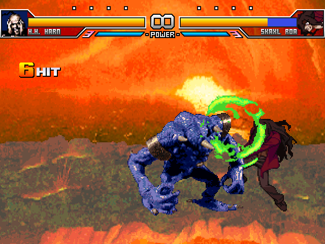 okay random progress update, slew of screenshots comin'getting the hang of how helper projectiles work, as the first screenshot shows a projectile where it goes upward and then bounces downward. the majority of his specials, if not all of them, are done at this point. i just need to do his throw, his super and his mash A 'combo'. also fiddling with the juggle gravity and such, cuz the dashing knee attacks can do some serious wreckage in the corneroh and custom small portrait as well. everyone else in battle monsters had a scaled-down shot from their ending slide cards except harn who simply had a shot from his standing sprite. that's a really lazy move so i just made a custom one in the fashion of all of the other characters'side from the throw, super, hitfx tweaks and AI he's pretty much almost done, so 'stay tuned'