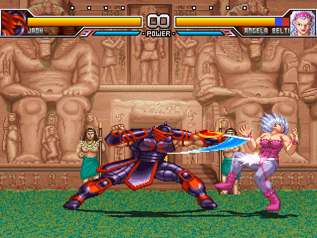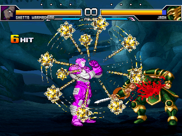 alright, so a few things. ghetto wm has all of his basics done, tweaked some of his supers AGAIN, etc... it's going kinda slow for now so now i'm doing a side project; jaoh from dragoon mightnow, this character's going to be a challenge. for one, there's no easy way of getting these sprites so i have to just break out animget and hope the camera doesn't zoom out when doing things. second, there's no way to completely turn off the music for voice clips, so i have to specifically fight on layla's stage with one of the audio channels muted because that's the quietest thing i could find. this still leads to things such as the winquote soundbytes being just one big audio blob, so...however, thanks to my bestest buddy drkelexo, he now has a palette template!few things about this: the stuff at the bottom are the general effect palette sets. since there's no clean way to get these sprites, the effects are pretty much on the sprites themselves. also the two blade color rows...the game has that weird thing where the weapons occasionally 'glow' so sometimes i get shots of those. if you're coloring those at all i'd recommend just copying both rows onto each other.but yeah, i'm not completely giving up on ghetto wm, hell no. he's been a fun character to make but i kinda need a break from one winged angel's messy as fuck template.and that's about that.