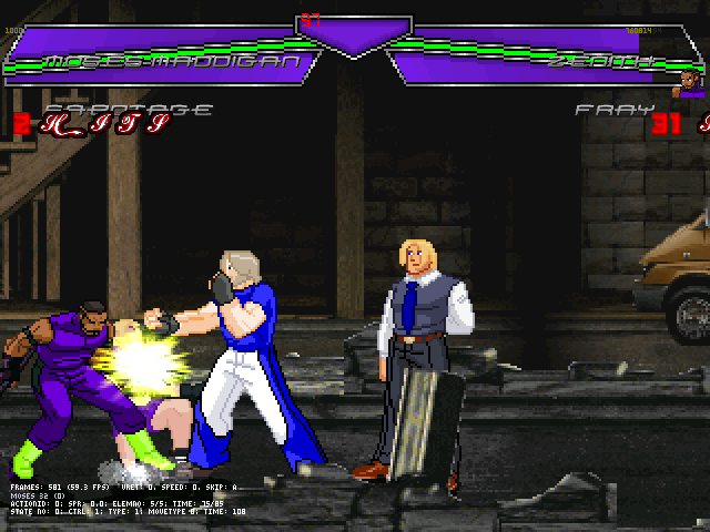 Just so everyone knows, the first set of lifebars, with the purple and green (the small neon green part is supposed to be the Super Meter), were drawn by me. I'd appreciate it, Robert the Small, if you did us all a favor and worked on finding a more constructive way of saying things. Your post came off as condescending and not at all helpful, only overly critical of a clearly-stated WIP and a bit laden with douchbaggery.The lifebars looked like that because they were drawn low-res, because I was unaware of how much space I had to work with. I could have drawn nicer-looking lifebars if I'd been aware of what I could do with the hi-res graphics. Instead Zeckle had someone take the base concept of my design and create better looking ones, which I'm fine with.