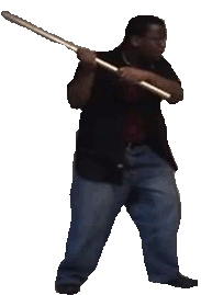 okay so the old biography from the last thread:MDISinister, as a lot of you may know, is working on his game Thunder Duelists, and a lot of footage is being revamped. so he handed some old footage of two characters for me to do something with. and i started working on that this weekendthe sprites, anyway.so basically the character is portrayed by reginald dyson, who you may remember is the face and voice of ghetto warmachine, and here he is Reggie Skatore (basically his real name but his last name replaced with that of the 24-7 Spyz bassist's name). he has a stand called Disco Volante (named after the Mr. Bungle album) which is represented by another scrapped character (formerly known as Count Crackula portrayed by syed jamal, who was the actor who is shown in GWM's 'why bother man' winpose)this character isn't going to be jojo styled though.still here? okay. so basically i wanted to work on him again but...i didn't like his moveset. so i'm revamping it completelyvideos would be totally outdated so here's some other 'proof' i supposenow for the moveset. lemme know if any of this sounds dumb, useless or broken as hell, thanx!SPECIALS:* Pavement Saw (charge back, forward, P):Weak variant dashes forward a bit with a swift slash from his staff.Heavy variant dashes further and hits three times, but has considerably longer start-up.* Natural High of Bloodstone (charge down, up, P):Weak variant shoots Reggie upward for a short distance and height. Essentially a standard uppercut.Heavy variant has longer start-up but shoots farther upward and takes him a bit farther.* Bye Bye Bye (charge back, forward, K)Weak variant dashes forward a bit with a sliding kick that hits low.Heavy variant dashes further and hits three times, but has considerably longer start-up.* The Miracle of Sound in Motion (qcf, qcb, K)Waits for a bit, hops back and a burst of freezing air emits from the ground in the place he was performing the move.Heavy variant takes a bit longer to process but the air hits three times and shoots higher.Basically a shameless take-off of his move in Thunder Duelists, ‘Hip to be Reg’.SUPERS:* Good Weather for an Airstrike (air variant also possible) (df, df, P)Basically very reminiscent of DIO’s knife super, hurls a barrage of multiple objects such as wooden spikes, Wendy’s Frosties, etc. Air variant shoots these downward.* Malpractice (qcb, qcf, K)Begins spinning furiously and moves forward slowly. If the opponent is hit during this they will be drawn in and slashed multiple times. If it misses it leaves Reggie wide open to be attacked.** Didn’t We Deserve a Look at You the Way You Really Are (qcf, qcf, K)Basically a take off of Hyo Imawano’s super; Reggie throws out a kick. Uponconnecting, a wooden clone of Reggie appears behind the opponent and they begin pummeling the opponent and end with a variant of Natural High of Bloodstone. If it misses Reggie has no cooldown and isn’t open for an attack (again like Hyo’s).*** Deathstyle (qcb, qcf, P)Reggie dashes forward very far and very fast, and upon connecting, he does a combo on the opponent as his Stand builds a tower of Jengas, which then collapse on the opponent to do major damage. If he misses this attack he’ll slam into the wall and do slight damage to himself.and that should be it. if i can i'll get some videos of the new moves up, but for now it's back to the drawing board