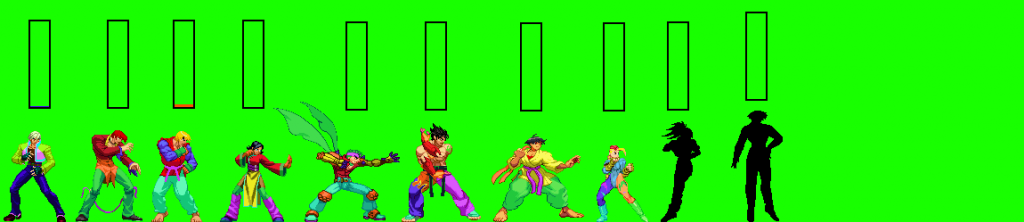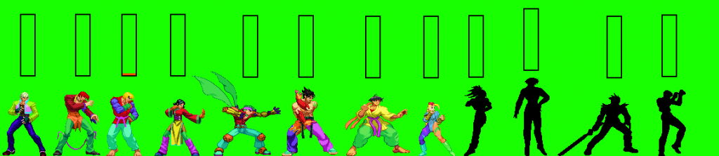 This system is inspired by Capcom Vs SNK's Groove select system. Basically, you can choose between one of three bars. Each bar gives character certain moves depending on the bar. The bars also provide a special power up mode to each of them that causes a bad side effect after using it and can only be used once. The three bars are called Fire, Ice, and Thunder. Also like CvS, The characters will have 3 punches and kicks.