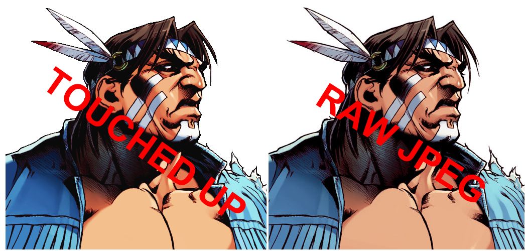 OK. This is my first attempt to show all of you what goes behind the process of my portrait releases. I saved the below two examples in the form of a .jpeg file, and it takes away from what I intend to point out quality wise. From the next share onward, I'm going to save in a clearer format. Silly me and my first attempt. Here is a sampling of Chun LiAnd here's a sampling of T Hawk**For best comparison results, save these to your desktop and look around with a close zoom. You'll then see what I'm talking about below**When starting any portrait, I first go in and make sure that every possible black level is clean without any distortion. When you zoom in and look closely, comparison wise, you'll see a shit ton of speckles that look atrocious throughout. Hence why I do that first. What follows is erasing/separating the portrait from it's white background while making sure it's edges look smooth and cohesive. I also make sure black levels of those edges are even as well, giving the illusion of a complete image that wasn't erased from it's background. I then go in and make sure that all fleshtones, color lines and gradients look as clean as possible. Note the complete and thorough lack of pixelation (There may be a slight amount here and there, but it's very minimal if so) in all of those areas. Also, I try to make all of the primary clothing areas, which are blues in this case, as clean and as pixel free as possible.Both Chun Li and T Hawk here took about 8 hours a piece to properly clean up. After that entire process, the portrait is free transformed to fit my signature 240x280 portrait size standard where further cleaning is done to finalize the image. I go the extra mile to ensure that colorloss from indexing and free transforming is non-existent. I'll post a comparison shot of T Hawk's indexed 240x280 image upon completion.Lastly, since my Marvel VS Capcom 2 and Street Fighter X Tekken sets, I have been saving each piece as a template so that I can transfer those images to any format if needed. Doing work this way saves a lot of time even though further indexing may be required if looking to make something for 1.0. With the release of 1.1, these templates can easily be manipulated to fit any screenpack with minimal correction outside of edging since there isn't ant colorloss. Epic win either way!! Thoughts and feedback are always welcomed. And apologies for posting in .jpeg format!!