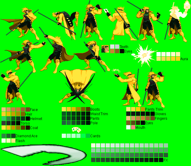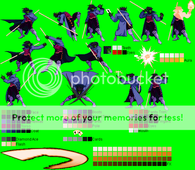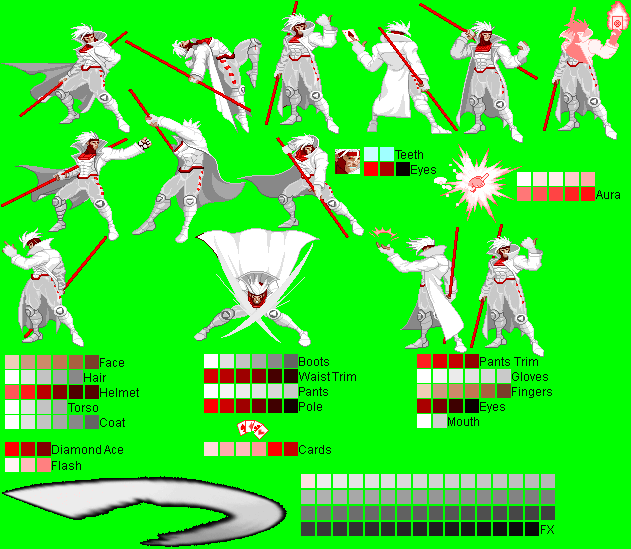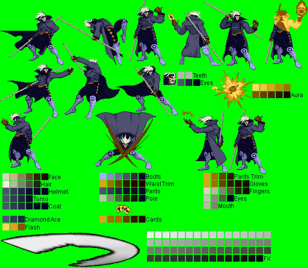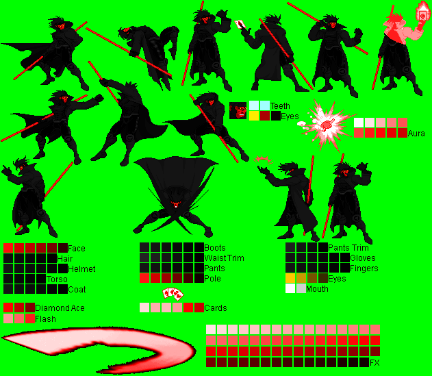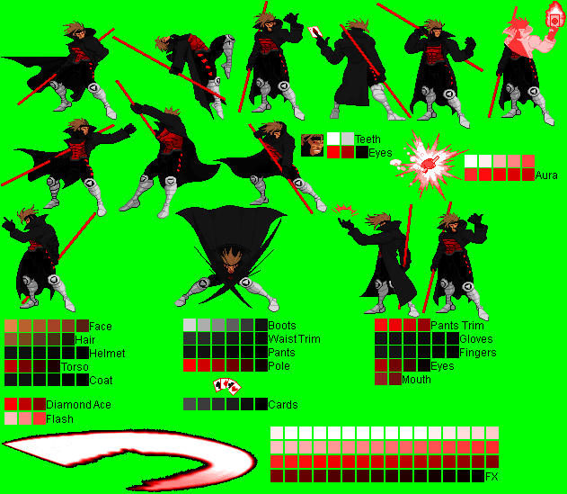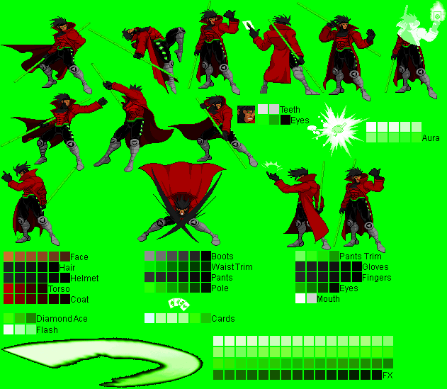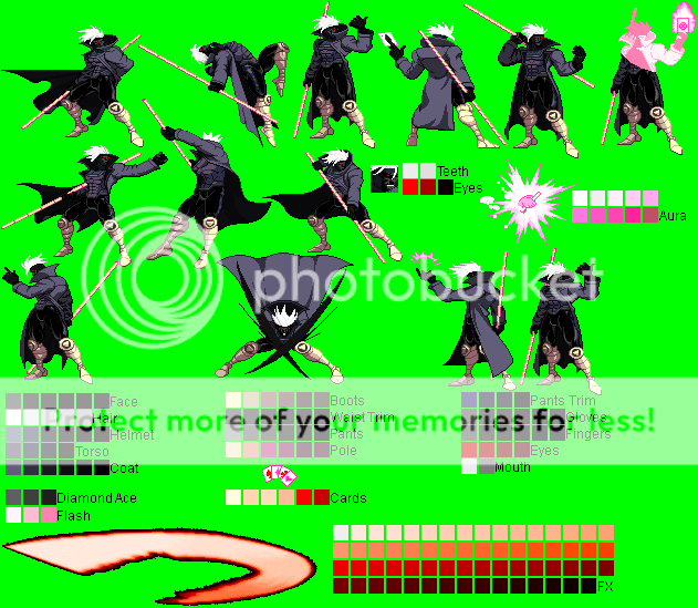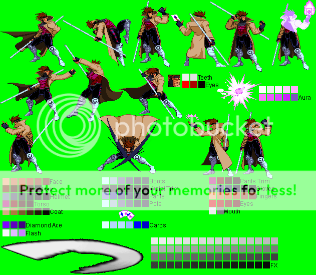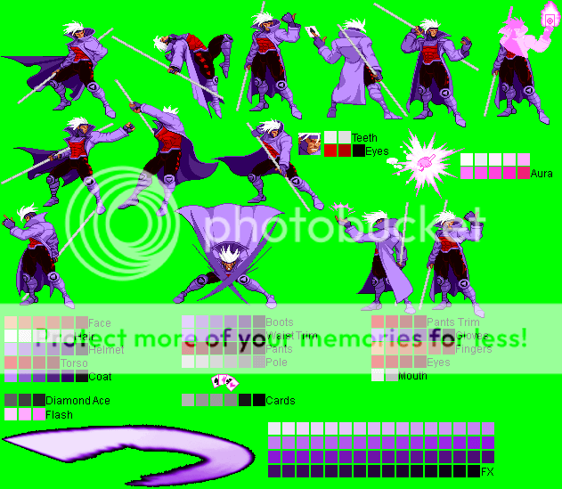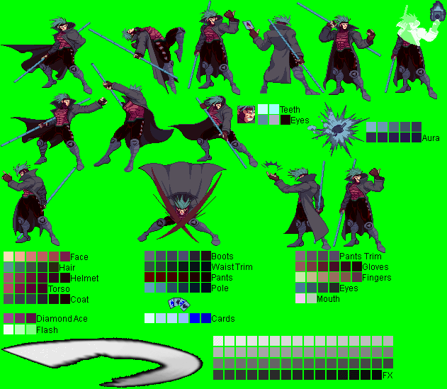 Gambit - Ninja Gaiden Black Mode Palette (running outta names ):^Made with a CvS Ryu Hayabusa sprite (forgot the spriter's name..)Gambit - Alucard (Castlevania) Mode Palette:^Made with PrimeOp's CvS Alucard sprite.